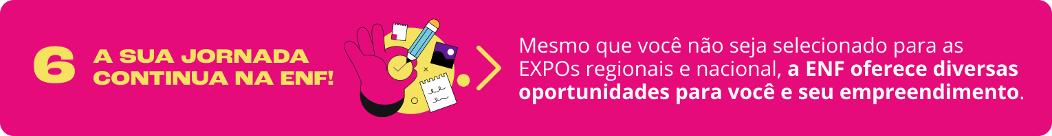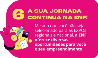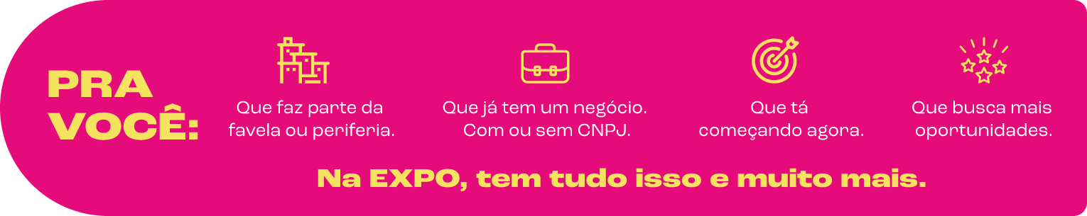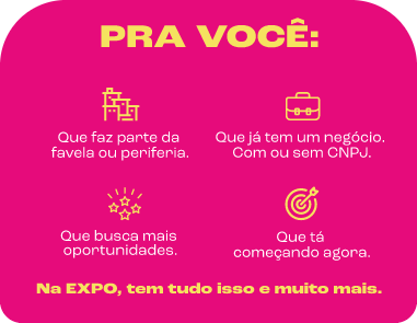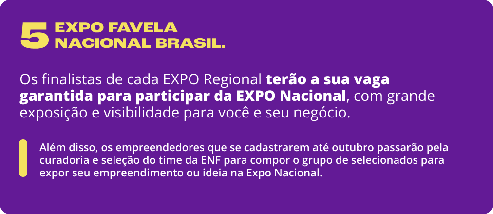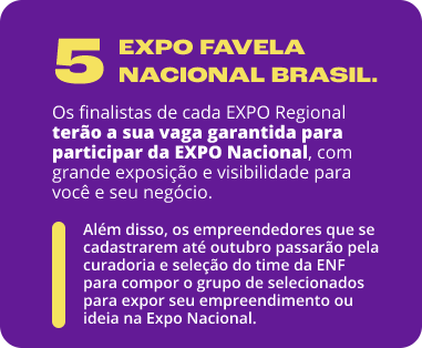 Ao participar da Expo Favela Innovation, você não só terá a chance de expor e vender seus produtos, mas também poderá alçar voos mais altos. Os 05 negócios mais destacados terão a oportunidade única de participar da etapa Nacional, podendo até mesmo concorrer a uma experiência incrível em um reality show na TV Globo.